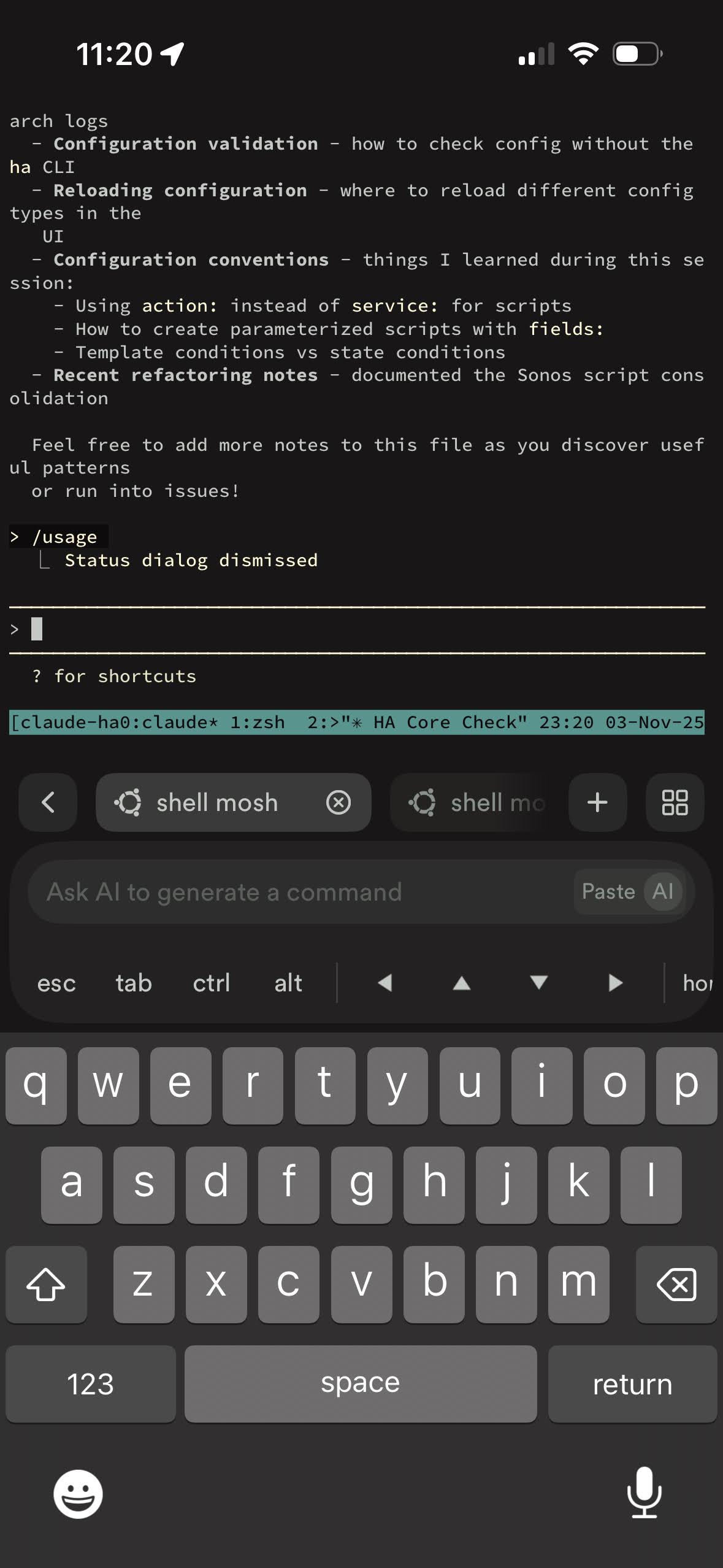 I don’t mind the tiny text size – I mind the lack of autocorrect and the loss of scrollback due to using mosh. Yet – it’s so dang useful I still use it almost daily while on the go; anything from hacking on the Metra Timetable to porting an Android app to iOS to editing Home Assistant automations.