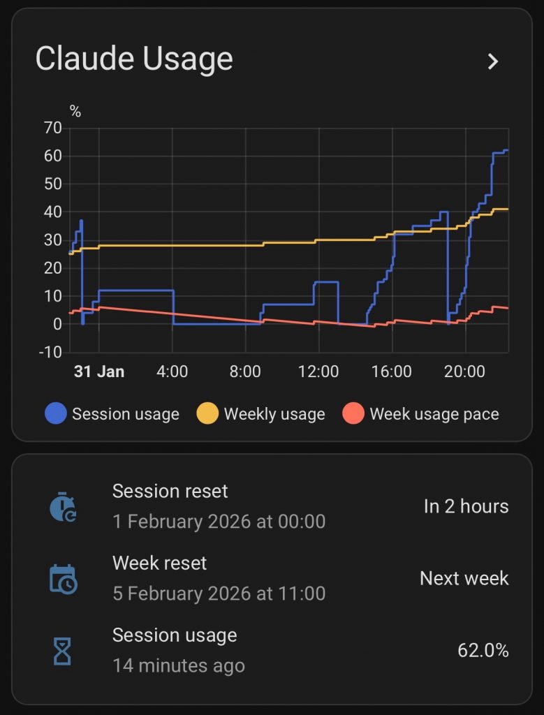 - First version which used the HA API to create sensors, and used Claude Code CLI in a tmux session to get usage data. It would run Claude Code, wait a few seconds, type /usage, and grep the output. It worked, albeit running claude code periodically contributed to usage! But it gave me a graph, and it was useful.