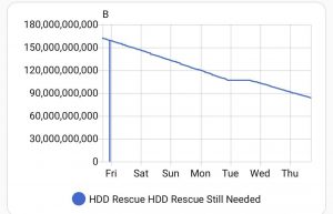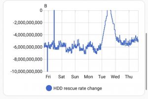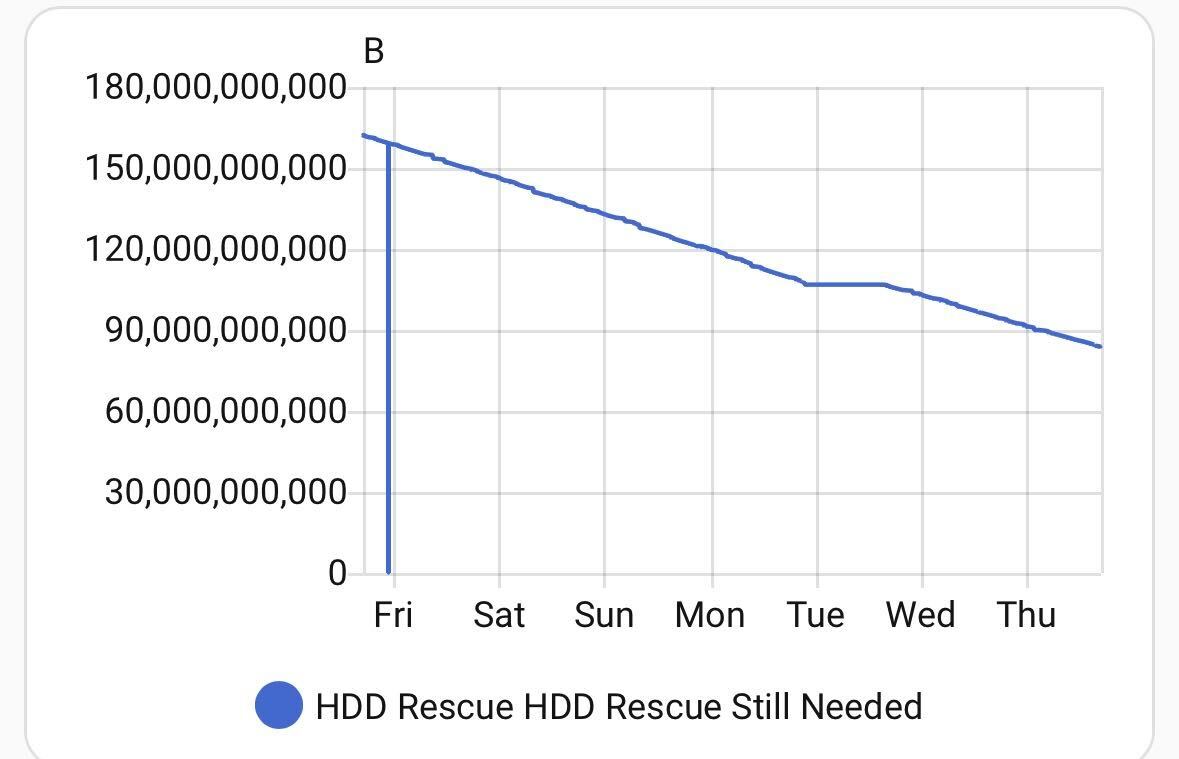 At the completion of the 100M chunk pass, I had a lot more of the data, but I estimated that if I let it run on every block, it would take another 45 days to read it all at 131kB/sec – and that’s not counting power cycles (which became so numerous I stopped paying attention and just kept hoping that the next power cycle would not be the disk’s last.)