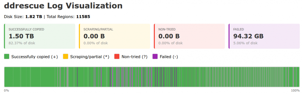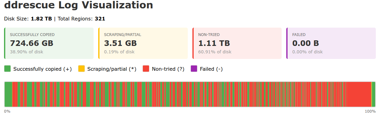 The log file is a long machine-readable text file not meant for humans. It has one block range per line, so on every ddrescue run it got longer. The ddrescuelog CLI tool didn’t work for me for some reason. I threw this one at Claude Code which wrote a CLI and HTML visualizer:
