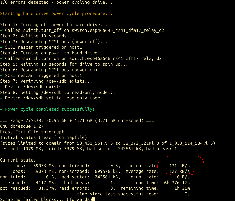 Now that I had a working power cycle procedure, I could try reading the entire disk in segments. I wrote a simple wrapper which ran ddrescue at 10GB increments, wrapped in a bash “timeout 120” which meant that if I hit one of those 131kB/sec slow spots, or the disk timed out and needed a power cycle, that ddrescue would exit out. The loop turned into: