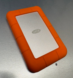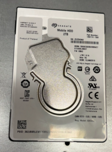 The packaged disk is a LaCie 2TB portable USB hard drive. Inside is a standard 2.5″ SATA disk, a Seagate ST2000LM007 which has two spinning platters inside of it.