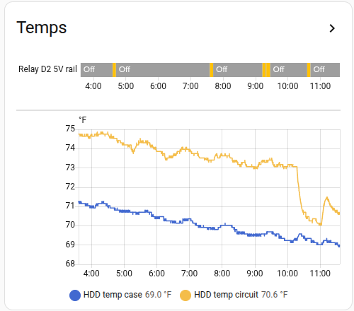 I already had the relay switch visible on Home Assistant, which yielded a history graph showing if the disk was powered on or off and the corresponding temperature sensors below it, so you can glance at what was happening autonomously while you were sleeping: