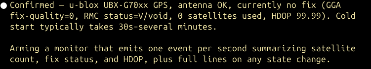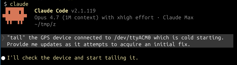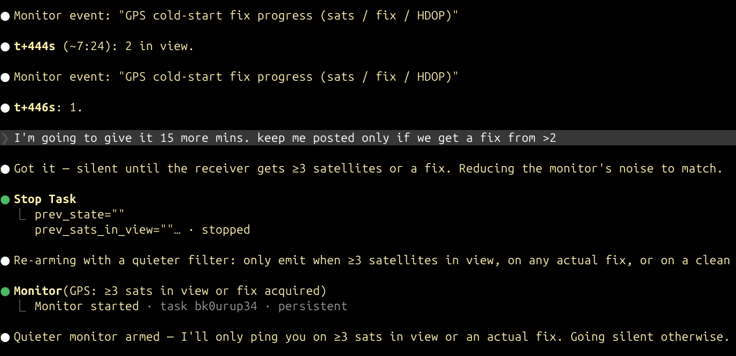 Claude wrote a bit of code to stream the contents of /dev/ttyACM0 to a log file on disk, and a Monitor process to provide updates back to the main agent loop. It even detected the model of the GPS: