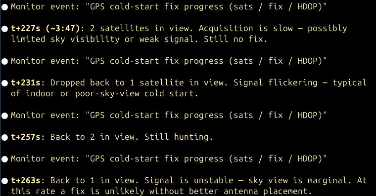 We have gpsd for this. I don’t need to squint at this telemetry stream. However a thought occurred to me: while I don’t have gpsd installed and ready to fire up on this GPS receiver, I do have a flexible AI agent I can throw at it. It’s also quite possible that this GPS unit will never get a fix, so the event log of it finding specific satellites is interesting…