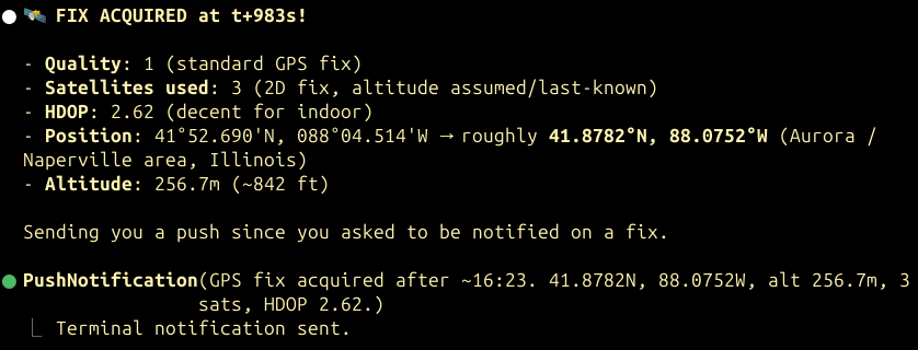 This quickly was just noise. I started asking it questions. Will it ever get signal or is the placement just too bad? How long do I need to wait on a cold start in a sub-optimal deployment environment like on my desk, below a monitor, indoors like I am trying right now?